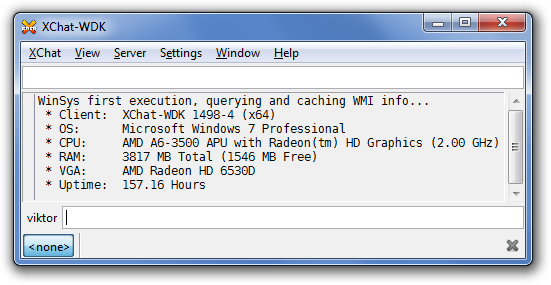 WinSys is a sysinfo plugin for XChat-WDK. It uses highly Windows-specific code to display some info about your hardware and OS. Using WinSys is really simple: just click on Window -> Display System Info, or type /winsysAnd the info will be printed out. If you're on a server tab, it gets printed out line by line (and will be visible only to you), but if you're in a channel or private conversation, it's shortened to just one line to avoid spam. ![]() The first execution takes a few seconds to finish, but from then static information is cached so additional executions should be instantaneous. The source code is available in the repo. |
