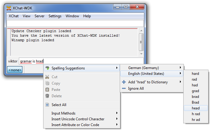 XChat-WDK uses MySpell for spelling via the Enchant library. The required libraries are included in the installer, but the dictionaries are big so they are distributed in a separate installer. If you want to have spelling, just download and install the Spelling Dictionaries. They're from Debian Lenny. The notes about Aspell on the official site are irrelevant. Since XChat-WDK uses MySpell instead of Aspell, you don't need to install Aspell at all. ![]() If you find better MySpell-compatible dictionaries than the ones found in the installer, you can easily update the installed ones, just simply overwrite them (they are in share\myspell\dicts). If they're not compatible with MySpell you'll know coz it will crash XChat-WDK :) You can specify the desired dictionaries under Prefereces/Input box. You need to specify their language codes which can be found in the share\myspell\dicts subfolder. By default it uses the LC_ALL environmental variable, or if it's unset, it falls back to en_US. Note: you have to restart XChat-WDK for the changes to apply. |